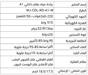 - إنتاج المياه الباردة: 2 لتر في الساعة، بدرجة حرارة تصل إلى أقل من 10 درجات مئوية.