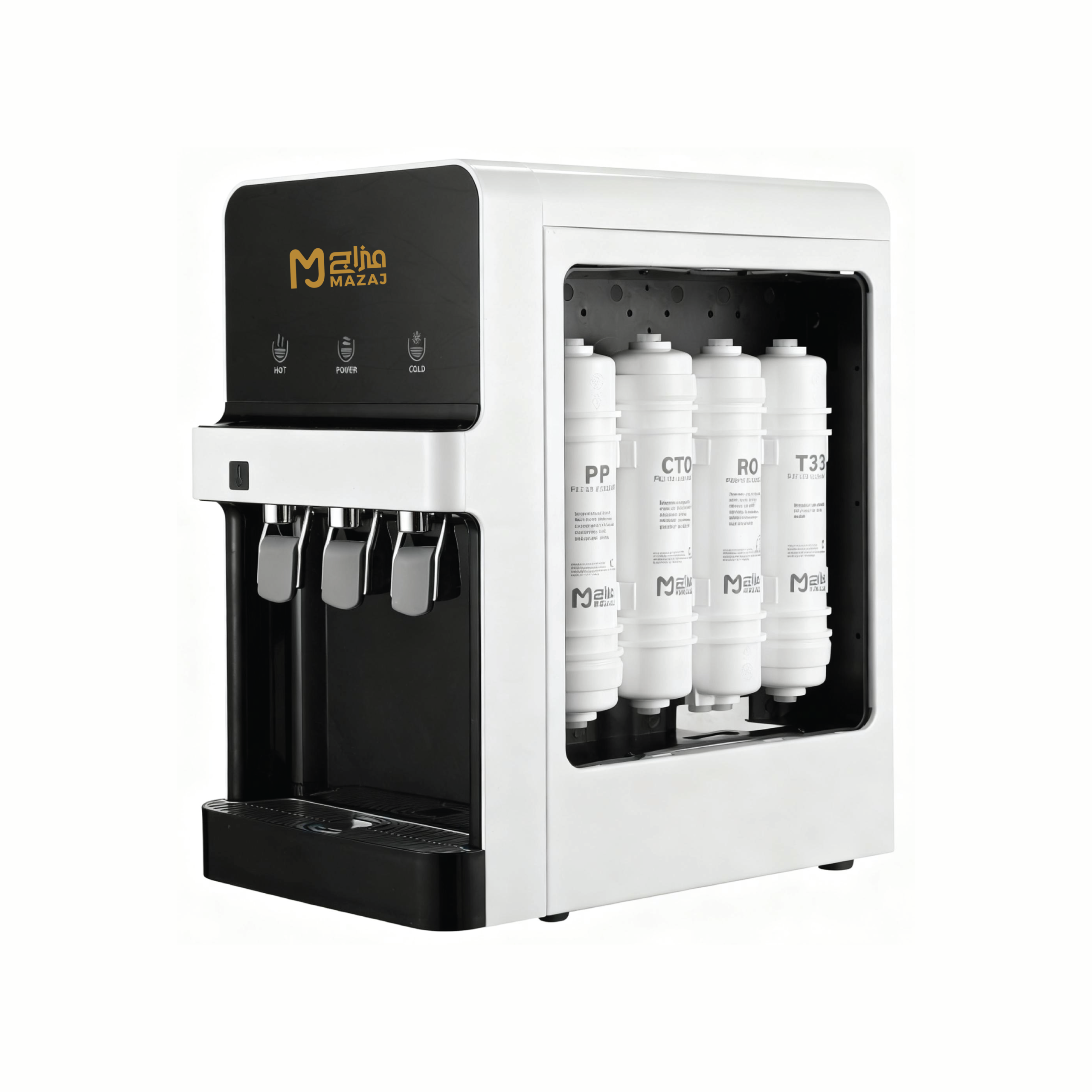 - تفعيل الوظائف: قم بتشغيل مفتاح الماء الساخن (الأحمر) ومفتاح الماء البارد (الأخضر) من خلف الجهاز.
